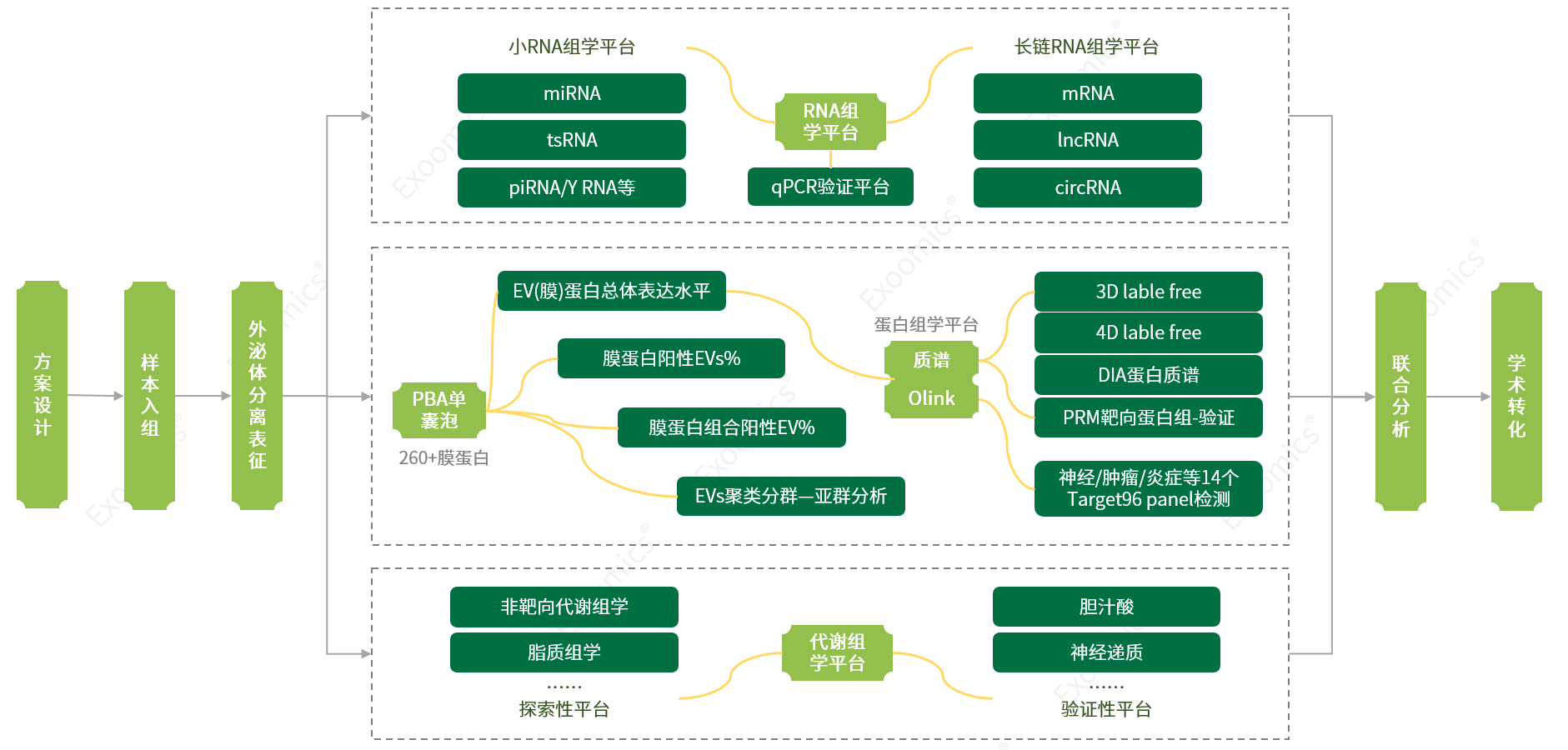 Exoomics®技术平台,集成了多研究层次的外泌体多组学平台和强大的生信分析平台,建立了外泌体标志物开发平台,产出了60+外泌体标志物研究合作成果,总IF 550+!
