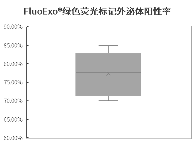 使用本试剂盒标记293F外泌体参考品(Cat# CTE-061)并使用袖珍柱纯化,而后使用NanoFCM检测外泌体标记阳性率,表明大于70%以上外泌体可被标记,且外泌体阳性率平均为77.38%。