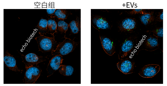 按照试剂盒说明书对货架293F外泌体CTE-06进行绿色荧光标记,加入受体细胞中孵育24h(建议荧光标记外泌体颗粒数与接种细胞比例大于5000:1),受体细胞的细胞膜和细胞核分别用红色细胞膜染色剂和 Hoechst 标记,激光共聚焦显微镜扫描结果表明:标记的外泌体 (绿色) 被受体细胞摄取(其中空白组为不加外泌体组)。