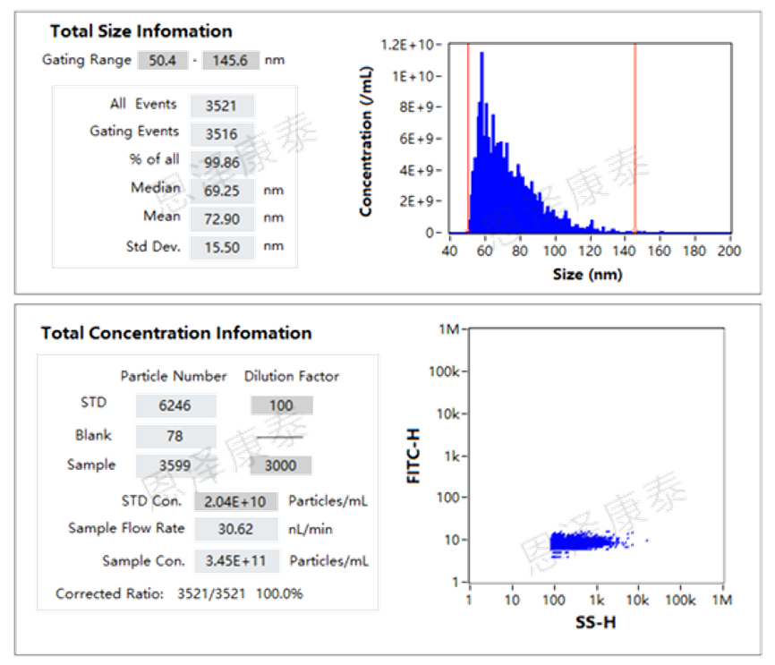 粒径:以二氧化硅硅纳米颗粒为标准品,利用一系列粒径已知(经 TEM 表征)的二氧化硅纳米颗粒的混合物,建立散射光强度与颗粒粒径的标准工作曲线,即可将同等采样条件下EV的散射光强度转换为颗粒粒径。
