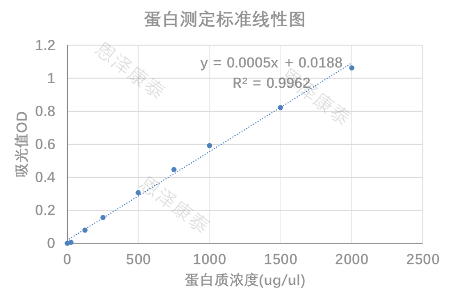 基于双缩脲原理,碱性条件下蛋白质将Cu2+还原成Cu+,BCA(二喹啉甲酸)鳌合Cu+作为显色剂,产生蓝紫色并在562nm有吸收峰,单价Cu+与蛋白质呈剂量相关性。可以根据待测蛋白在562nm处的吸光度,与标准曲线对比,便可计算待测蛋白浓度。
