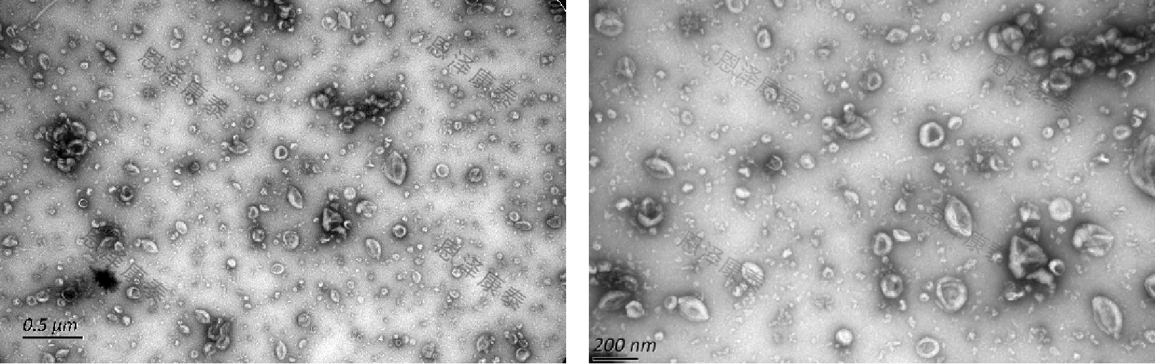 经加速和聚集的电子束透射到预制备的非常薄的外泌体样品上,电子与样品中的原子碰撞而改变方向产生立体角散射。散射角的大小与样品的密度、厚度等相关,因此可以形成明暗不同的影像,经放大、聚焦后在荧光屏上显示出外泌体的影像。