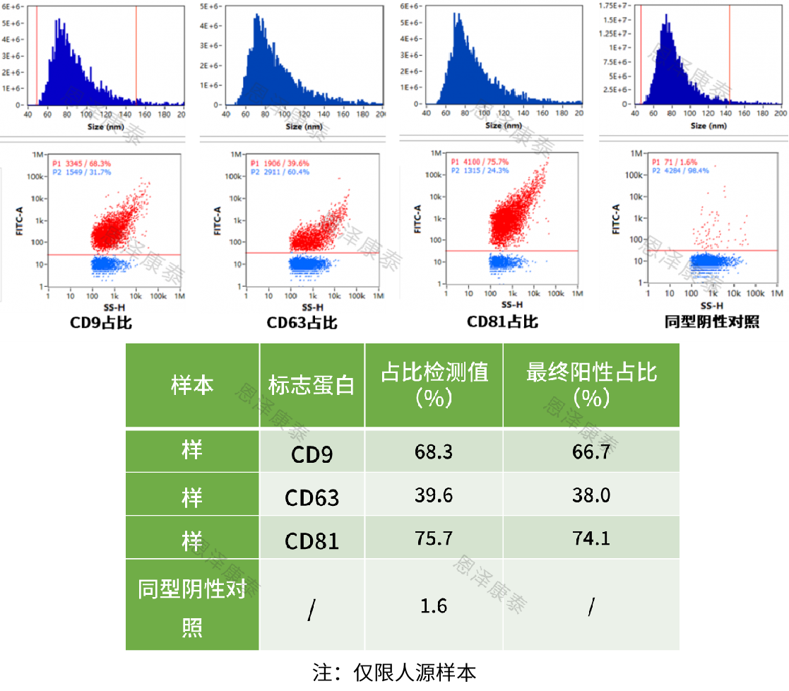 外泌体上有CD81/CD63/CD9标签蛋白,分别使用荧光标记的CD81/CD63/CD9抗体与外泌体一起孵育结合后会产生较强荧光,纳米流式仪能够完全区分散射光和荧光,进而检测出带有CD81/CD63/CD9蛋白的外泌体颗粒阳性占比。从而反映出外泌体的纯度,或不同来源/不同纯化方式/特殊处理下的外泌体的表面标志蛋白阳性占比。