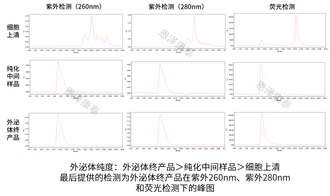 外泌体:在特定波长下有特征荧光信号,外泌体包裹的蛋白和核酸在紫外280nm和紫外260nm下有弱吸收峰,在特定保留时间下出峰