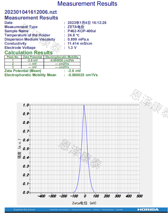 在样品的两端加一个电场,导致颗粒加速运动,散射的激光因为颗粒运动而产生频率变化(多普勒效应),散射的激光和原始光源之间的相干产生一个调制的信号,分析频率变化可以计算电泳迁移率,通过Henry方程计算粒子在该体系中所带的电荷情况(Zeta电位),-500mV-500mV。