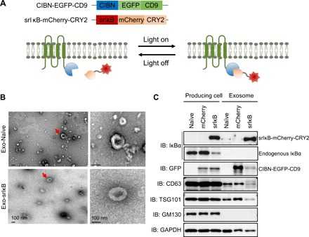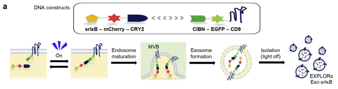 细胞外囊泡通过将细胞物质转移到受体细胞,在细胞间通讯中发挥积极作用,外泌体作为一种天然的治疗药物递送载体,具有很大的潜力。多种疾病模型中的炎症反应可通过引入超抑制因子IκB (srIκB)来降低炎症反应,srIκB是IκBα的主要活性形式,可抑制核因子κB向细胞核的易位。该研究团队之前开发的光基因工程外泌体系统(EXPLOR)可将大量的srIκB装载到外泌体中。作者发现,在脓毒症小鼠模型中,腹腔注射装载了srIκB的外泌体(Exo-srIκBs)可以降低死亡率和全身炎症。在生物分布研究中,发现Exo-srIκBs主要存在于小鼠的中性粒细胞中,少量存在于小鼠的脾脏和肝脏的单核细胞中。此外,研究还发现Exo-srIκB减轻单核THP-1细胞和人脐静脉内皮细胞的炎症反应。