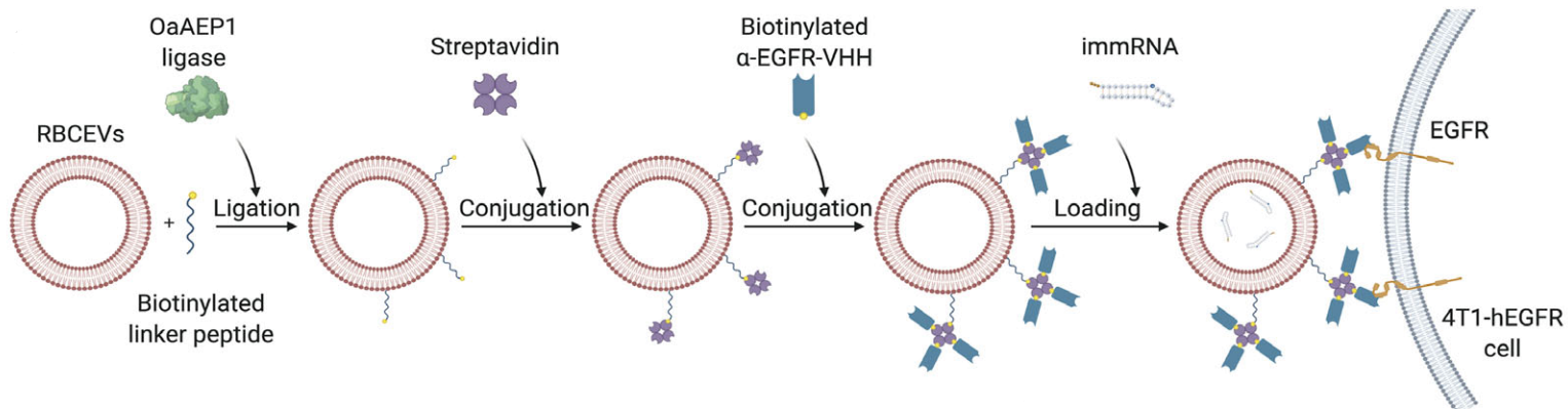 RIG-I通路可被含有5'三磷酸的RNA激活,导致I型干扰素释放和免疫激活。因此RGI- 1激动剂作为潜在的免疫疗法已被用于诱导针对癌症的免疫反应。然而,体内将5'三磷酸化RNA分子作为RIG-I激动剂递送到肿瘤细胞是具有挑战性的,因为这些分子容易降解。本研究展示了红细胞来源的细胞外囊泡(RBCEV)用于RIG-I激动剂的递送。首先作者评估了两种新型RIG-I激动剂的抗癌活性,一种是具有独特二级结构的免疫调节RNA (immRNA),可以有效激活RIG-I;另一种是具有RIG-I激活和miR-125b抑制双重功能的5'三磷酸化反义寡核苷酸(3p-125b-ASO)。RBCEV递送的immRNA和3p-125b-ASO可触发RIG-I通路,诱导小鼠和人乳腺癌细胞死亡。此外观察到,在多次瘤内注射装载immRNA或3p-125b-ASO的外泌体后,肿瘤生长受到显著抑制,同时免疫细胞浸润增加,这是由RIG-I级联激活介导的。通过肺内给药,将外泌体与EGFR靶向的纳米体靶向递送immRNA,促进了外泌体在转移性癌细胞中的积累,导致有效的肿瘤特异性CD8+ T细胞免疫反应。这有助于显著抑制乳腺癌在肺部的转移。利用外泌体有效递送RIG-1激动剂的新策略,用于癌症和癌症转移的免疫治疗。