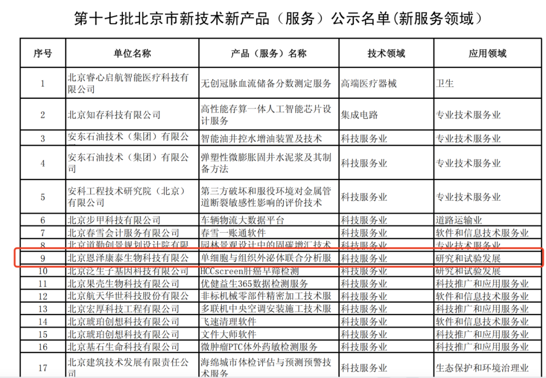 近日,北京市科学技术委员会、中关村科技园区管理委员会等部门公示了第十七批北京市新技术新产品(服务)认定名单。恩泽康泰自主研发的“单细胞与组织外泌体联合分析服务”凭借领先的技术与创新实力,获得北京市新技术新产品(服务)认证!截止目前,恩泽康泰已累计有6项产品获此殊荣。