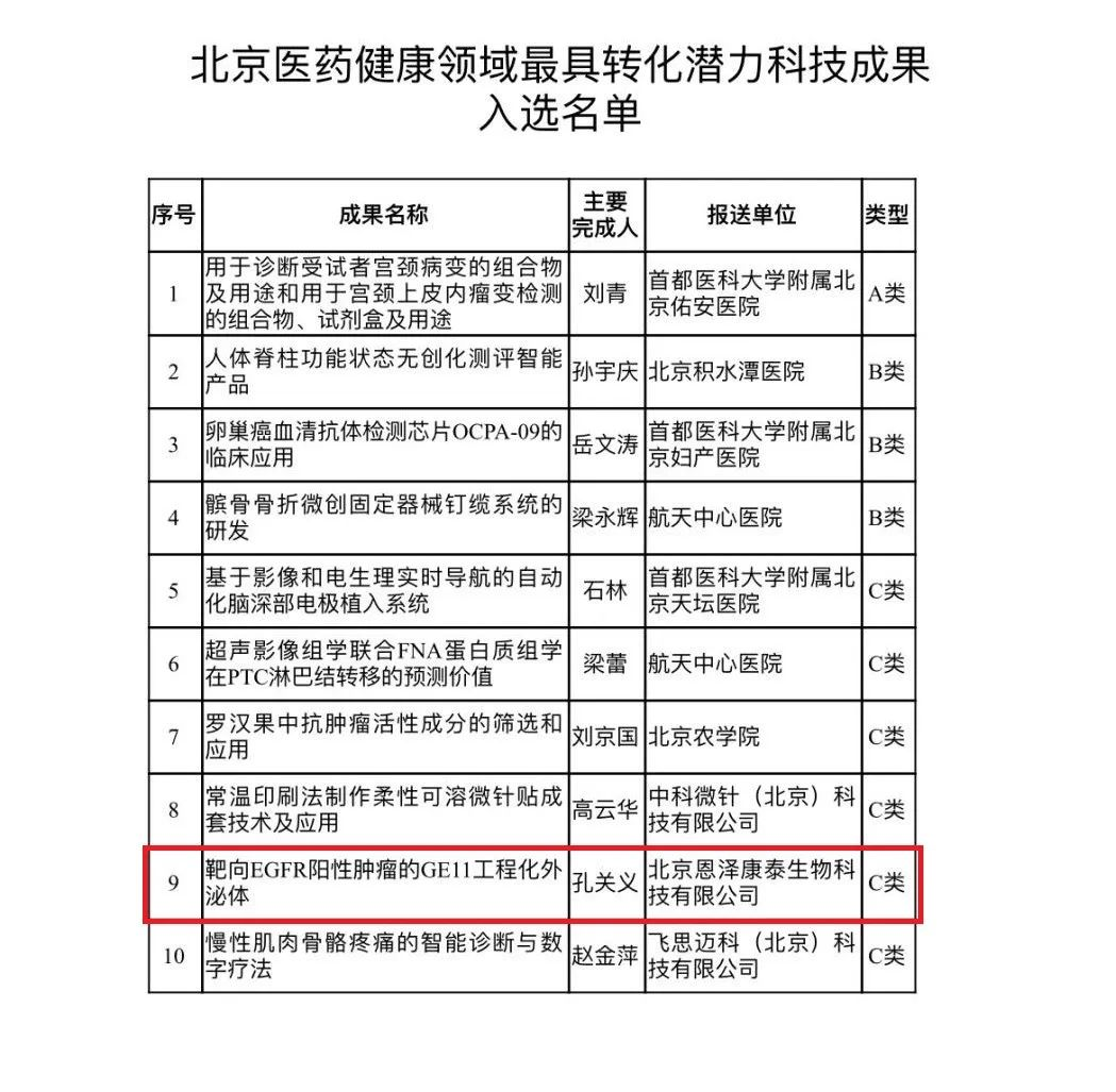 2022年12月5日,北京市科学技术协会发布了北京医药健康领域最具转化潜力科技成果遴选名单,经专家组评审,最终选定了10项医药健康领域代表性科技成果,北京恩泽康泰生物科技公司的《靶向EGFR阳性肿瘤的GE11工程化外泌体》位列其中。