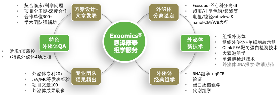 随着E100计划的开展,恩泽康泰也在持续不断地打磨质量体系和积累经验,打造了Exoomics®外泌体多组学平台,与您一起,共同攻克上述外泌体研究难题,提升项目的可实施性和转化潜能。