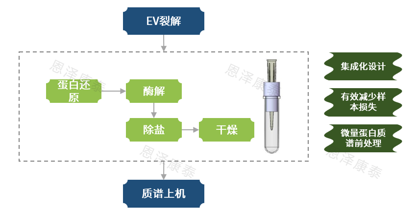 随着样品量的减少,表面吸附损失是一个非常严重的限制微量样本蛋白质组研究的挑战。因此基于使许多/所有样品处理步骤都在单个局部空间内进行的方法,可避免样品转移及导致的相关多肽/蛋白质损失。恩泽康泰引入集成化设计色谱小柱,蛋白质在上层离子交换填料中实现预富集,去除污染物及快速酶解为多肽;多肽经高浓度盐溶液转移至下层反相色谱填料中进行除盐及洗脱;预富集促进快速酶解,集成化设计可有效减少样品损失,多种溶剂清洗可保证获得干净的多肽。通过该方法将外泌体裂解蛋白起始量降低至5μg,质谱前处理后采用布鲁克timsTOF平台进行direct-DIA,可稳定检出2500-3500+血浆EV蛋白!!!