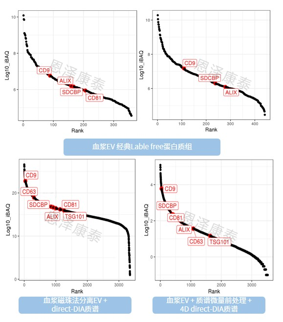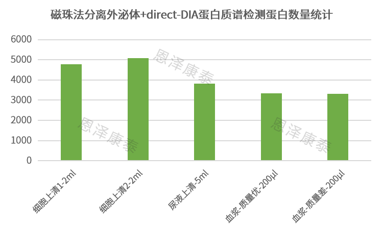 总之,常规血浆外泌体lable free蛋白质组,采用不同的外泌体分离方案大约可检测到200-1000个蛋白左右,恩泽康泰微量外泌体蛋白质谱平台,在血浆外泌体蛋白质组检测方面实现了量的突破和质的飞跃,5μg EV裂解蛋白检出2600-4000+蛋白,仅需要0.2-0.5ml血浆!细胞上清、尿液等恩泽康泰也进行了相关测试,更多数据,以及想尝鲜的老师请咨询恩泽康泰!