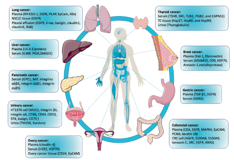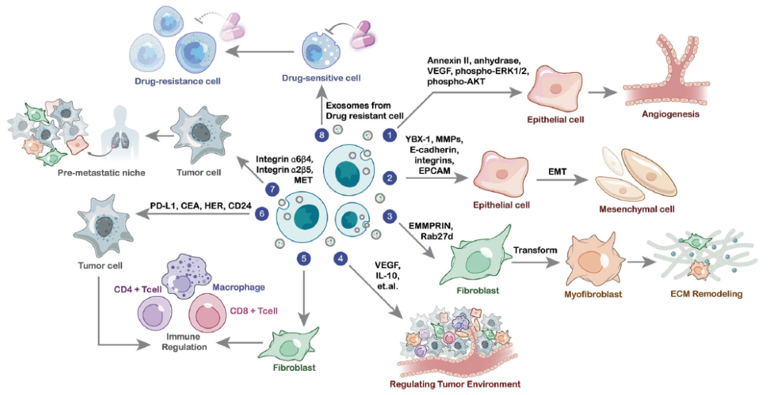 外泌体是由各种活细胞释放的脂质双层膜包裹的小细胞外囊泡(small extracellular vesicle, sEV),外泌体蛋白质被包裹在膜内或包埋在表面。外泌体蛋白作为一种重要的外泌体货物,可以反映母体细胞的生理状态,在细胞间通讯中发挥重要作用。外泌体蛋白可以调节肿瘤发展,包括肿瘤相关免疫调节、微环境重建、血管生成、上皮间充质转换EMT、转移等。外泌体蛋白质的特征可以深入了解外泌体的产生、靶向和生物学功能,是疾病诊断、预后和治疗的潜在标志物来源。