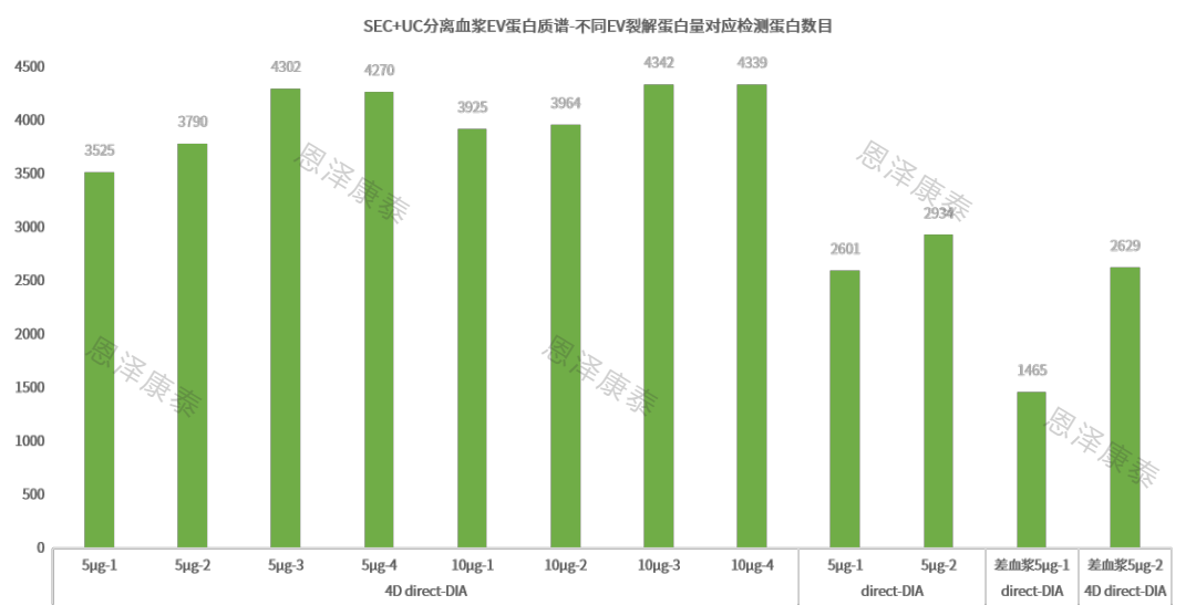 1)SEC+UC分离血浆外泌体后,取5μg EV裂解蛋白经微量质谱前处理后,direct-DIA蛋白质组检出1500-4300个血浆EV蛋白!