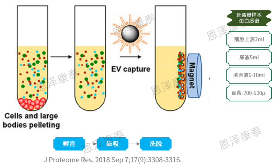 2)恩泽康泰适配于下游蛋白质谱,引入磁珠法外泌体分离方案:利用功能性修饰的磁珠特性以捕获总外泌体;针对复杂的血浆样本,在磁珠捕获法的基础上进行改良优化,添加抗体特异性捕获EVs表面标志性蛋白阳性的囊泡;磁珠法分离外泌体适合超微量样本direct-DIA蛋白质谱。