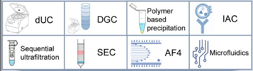 共分离的蛋白质(例如,血液中的高丰度蛋白质或脂蛋白颗粒)会限制sEV蛋白质的检测灵敏度,并使数据解释复杂化,sEV纯度是决定sEV蛋白质组学实验成功的最重要因素,因此需要额外关注sEV的分离方法。分离sEV通常利用其物理特性,包括大小和密度,或其生物特性,如表达的抗原。最常见的sEV分离方法包括差速超速离心dUC、密度梯度离心DGC、尺寸排阻色谱SEC、聚合物沉淀、免疫亲和捕获IAC,以及最近的不对称流场分级AF4和微流控。一个关键的考虑因素是样本类型,比如血清/血浆中含有许多与sEV尺寸相似的辅因子,如极低密度脂蛋白VLDL和中密度脂蛋白IDL,以及丰富的蛋白质。单纯基于尺寸的分离方法不足以从其他血浆/血清颗粒和分子中分离出高纯度的sEV。据报道,通过组合方法,特别是差速超速离心和密度梯度离心可提高sEV纯度,但这种组合通常需要更大的样品体积和更多的处理时间,这2个特征与临床研究不太兼容,在临床研究中,每个患者的血浆/血清体积有限。