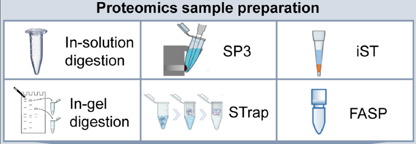 基于质谱的蛋白质组学是研究sEV蛋白质含量的首选方法,因为它具有极高的灵敏度和同时量化许多蛋白质的能力。蛋白质组学是一个不断发展的领域,其特点是仪器、方法和生物信息学方法的方法学快速发展。sEV蛋白质组学最广泛使用的工作流程是基于sEV蛋白质提取物的蛋白水解消化,然后使用纳米级液相色谱(nLC)结合串联质谱(MS/MS)分析蛋白水解肽,称为LC-MS/MS。随着样品量的减少,表面吸附损失是一个非常严重的限制微量样本蛋白质组研究的挑战。近来以极低蛋白质量为特征的样品蛋白质组学研究取得了许多进展,已经开发了几种能够针对有限样品量的质谱前处理制备方法,如phase-enhanced sample preparation (SP3)、in-stage Tip (iST) 、FASP、suspension trapping (STrap)和nanoPOTS等,目的在于:使许多/所有样品处理步骤都在单个局部空间内进行,从而避免了样品转移及导致的相关多肽/蛋白质损失。