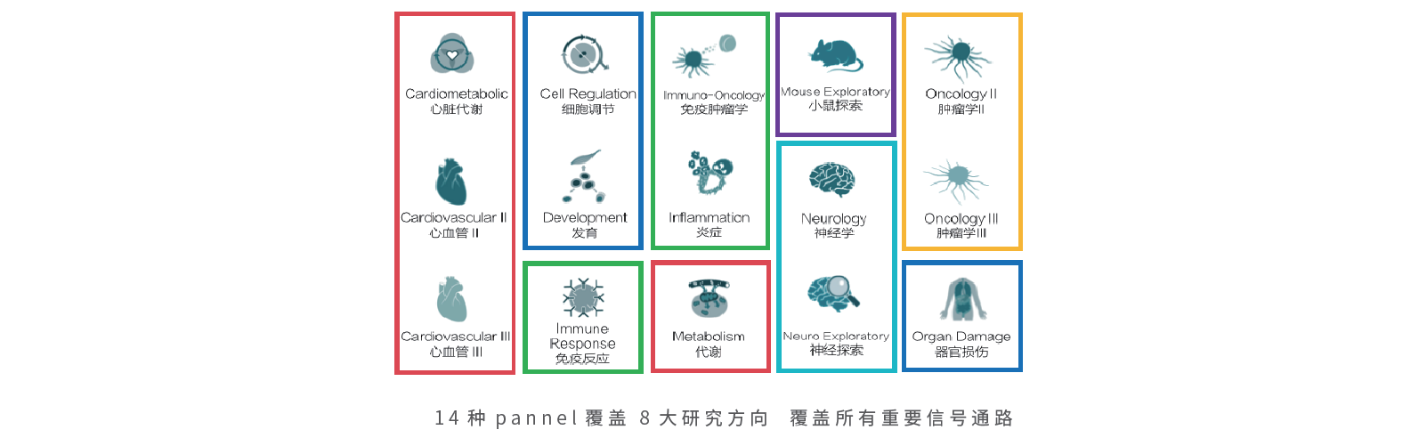 Target96 panel,涵盖人类心血管/肿瘤/神经/炎症等7个疾病panel,以及 器官损伤/免疫应答/发育等7个生理过程panel,以及1个小鼠panel
