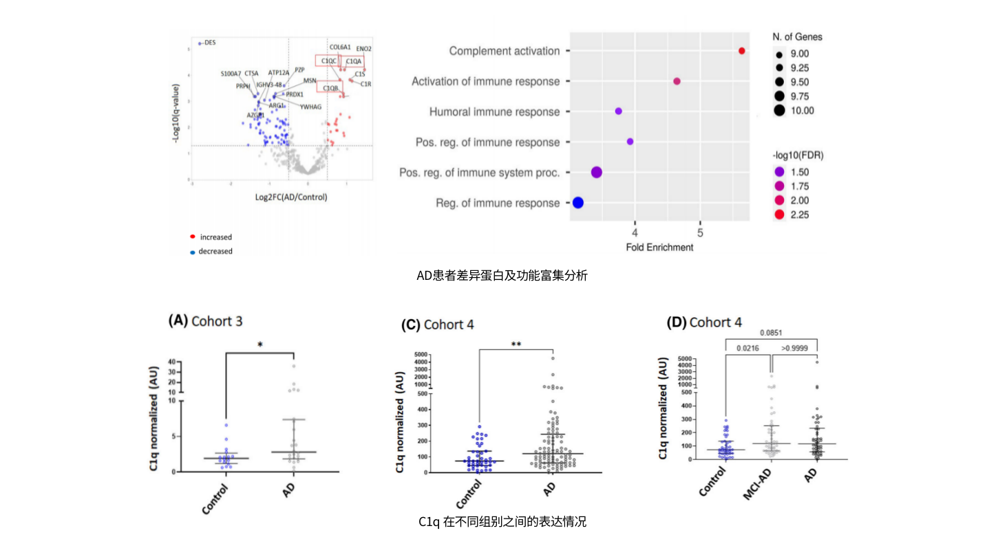 研究结果表明AD患者脑脊液EVs中的差异表达蛋白参与免疫调控。通过ELISA验证AD患者和对照组C1q含量,其在健康和AD患者组之间存在显著差异。EVs可能作为一种潜在的AD生物标志物,并可能在AD的免疫调节中发挥重要作用。该研究为AD外泌体蛋白标志物研究提供一种可行的思路。