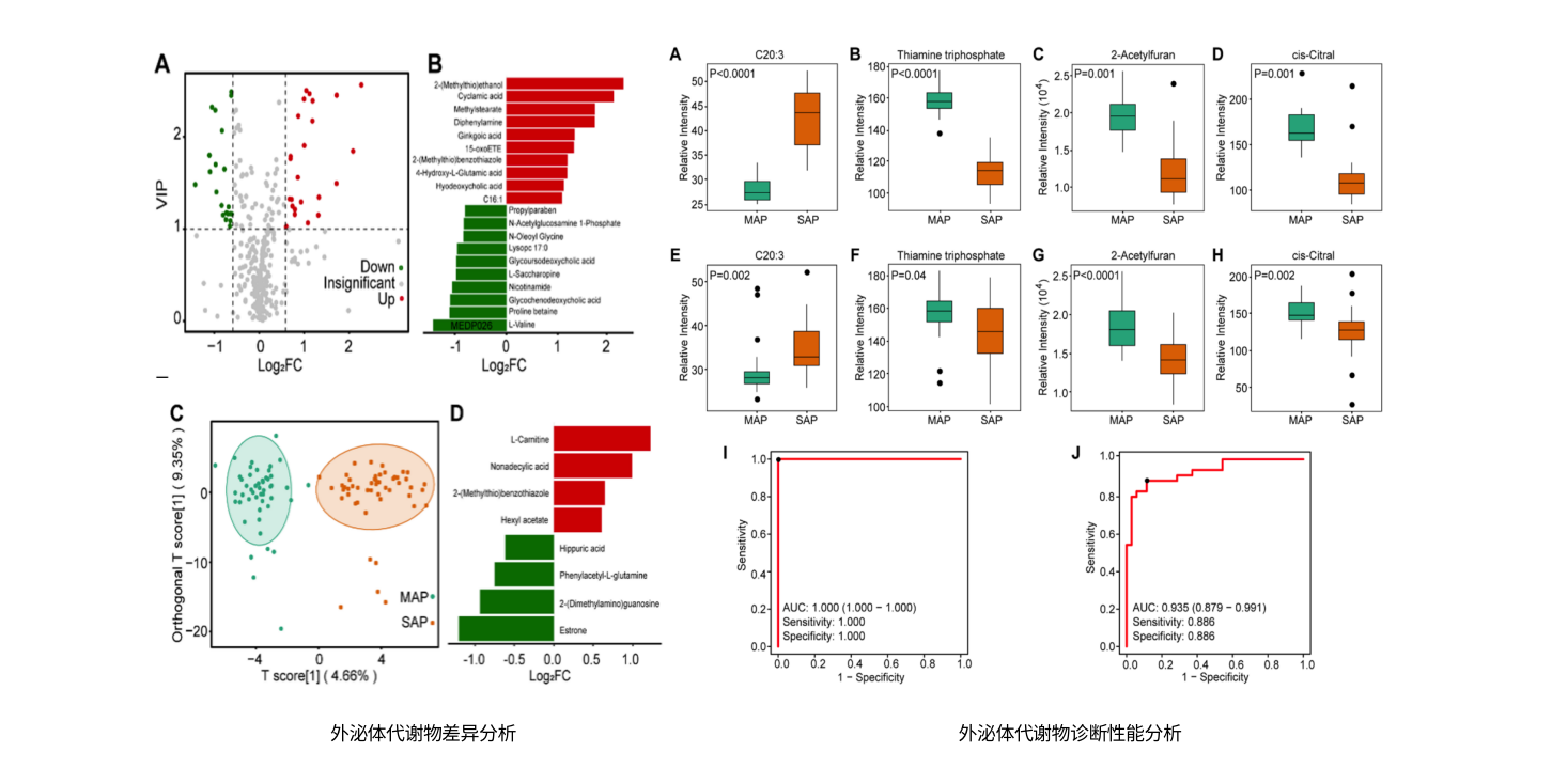 该研究纳入SAP患者,MAP患者和健康对照各50例,合计150例样本,进行血浆外泌体广靶代谢组检测分析。将SAP患者,MAP患者随机分成发现队列(N=30)和验证队列(n=70)进行SAP诊断标志物研究。最终在血浆EV中鉴定出了四种代谢物用于SAP诊断的生物标志物,包括二十碳三烯酸(C20:3)、三磷酸硫胺素、2-乙酰呋喃和顺式柠檬醛。这四种代谢物作为复合标志物在发现队列和验证队的AUC值均大于0.95。