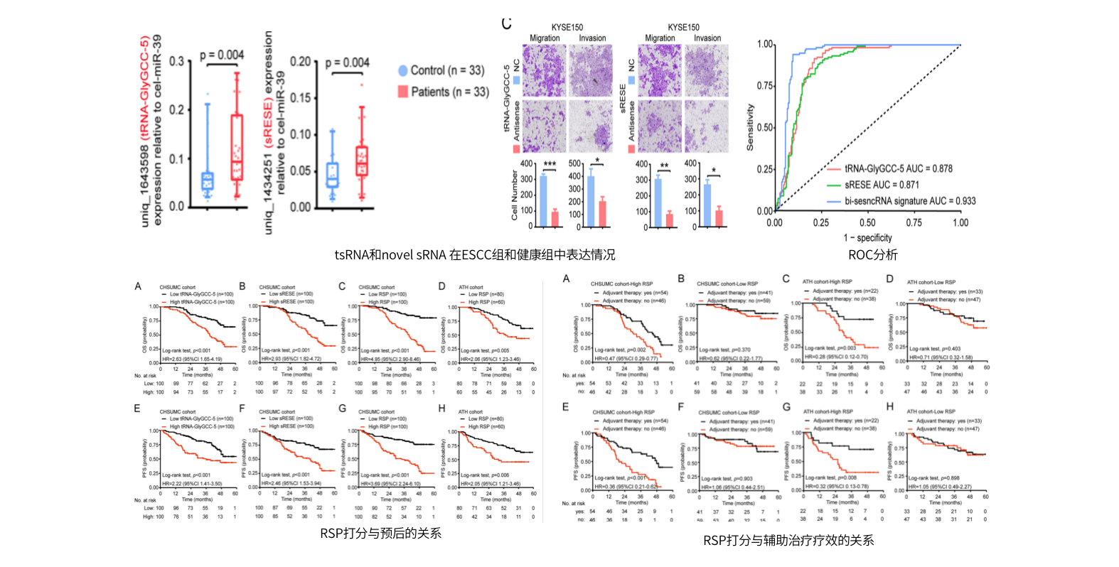 tsRNA(tRNA-GlyGCC-5)和novel small RNA在ESCC患者唾液外泌体、ESCC组织和ESCC细胞中显著富集,可以作为ESCC预测潜在标志物。验证队列ROC分析表明其可以高敏感(90.50%)和高特异性(94.20%)的区分ESCC患者和健康人。基于双标签风险打分(RSP)进行预后分析,研究结果表明高RSP组 患者的总生存期 (OS)和无进展生存期(PFS)均低于低RSP组。此外,辅助治疗可以改善高 RSP组的OS和PFS。在训练队列和验证队列我们也获得一致的结果。