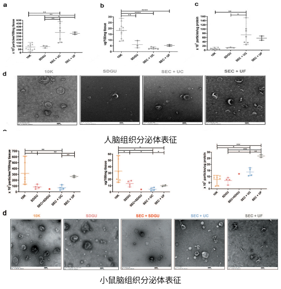 本文对冻存的人/小鼠脑组织进行切片,酶解释放外泌体,再通过离心去除碎片、杂质;然后分别采用蔗糖密度梯度超速离心(SDGU),分子排阻(SEC)+超离(UC),SEC+超滤(UF)三种不同的方法提纯外泌体,比较不同分离方法对外泌体纯度和得率的影响;结合外泌体miRNA测序衡量不同技术的分离效果。结果表明SEC+UC得率和纯度双高,可以作为组织外泌体分离的首选方法。